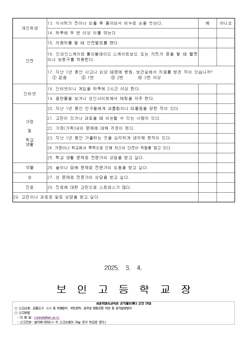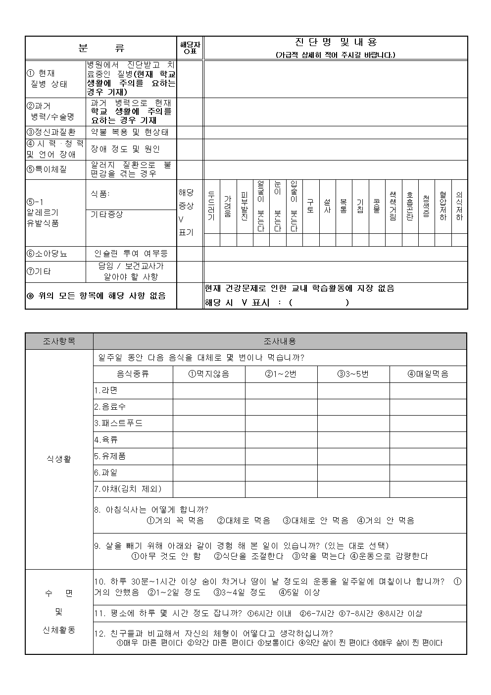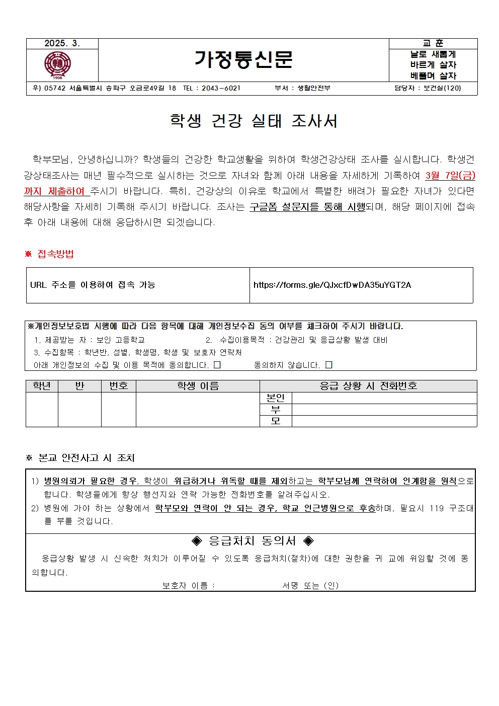 2025학년도 건강실태조사서 및 응급관리 동의서