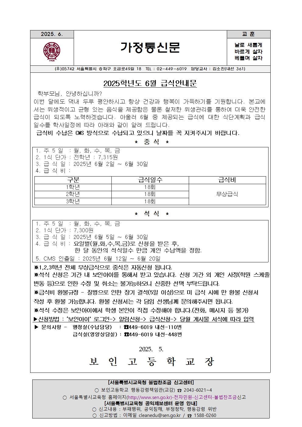 2025학년도 6월 급식 가정통신문 작성부서 / 내선번호 : 생활안전부 / 310 조회 : 904회 작성일 : 2025.05.21 13:42 신고 인쇄 스크랩 (고)6월 중식식단표.xls (45KB) (108) (고)6월 석식식단표.xls (44.5KB) (96) 수정 답변 삭제 목록으로 댓글 0개 | 엮인글 0개